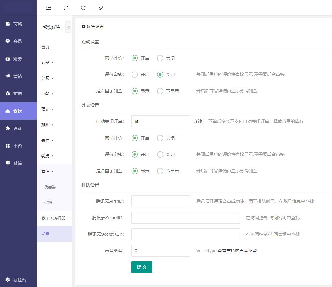 点餐设置:设置商品评价的开启;是否显示佣金开启(开启后商品详情页显示分销佣金)