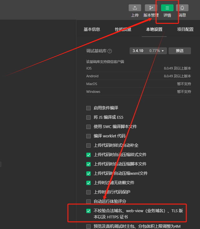 7、开发者工具,勾选“不校验合法域名、web-view(业务域名)、TLS 版本以及 HTTPS 证书”