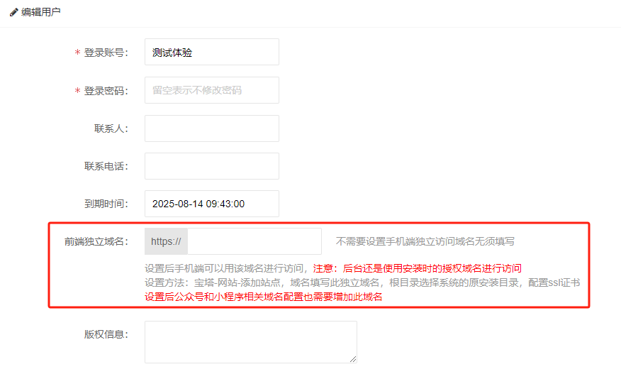4、如果账号配置了独立域名,需要将独立域名配置到业务域名处