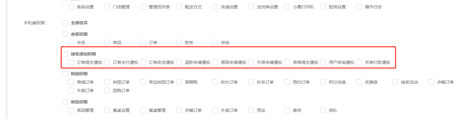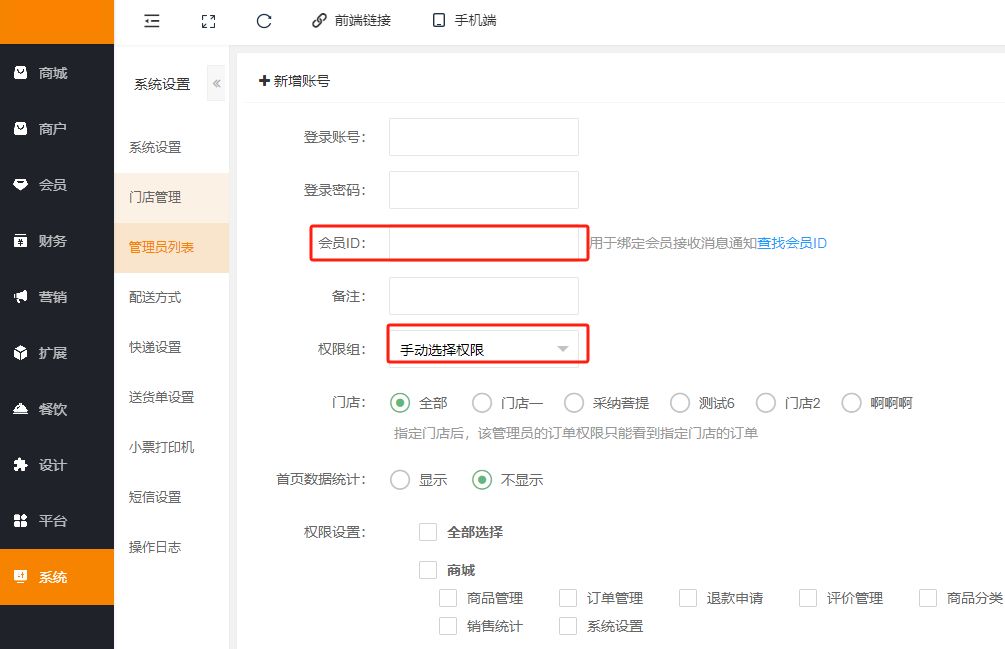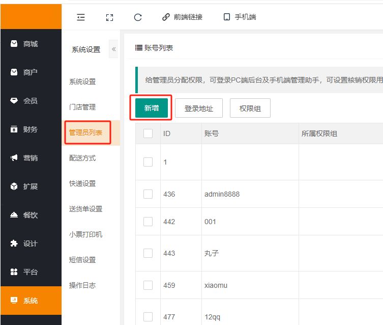 2、添加管理员,绑定会员id,选择手机端“接收通知权限”;