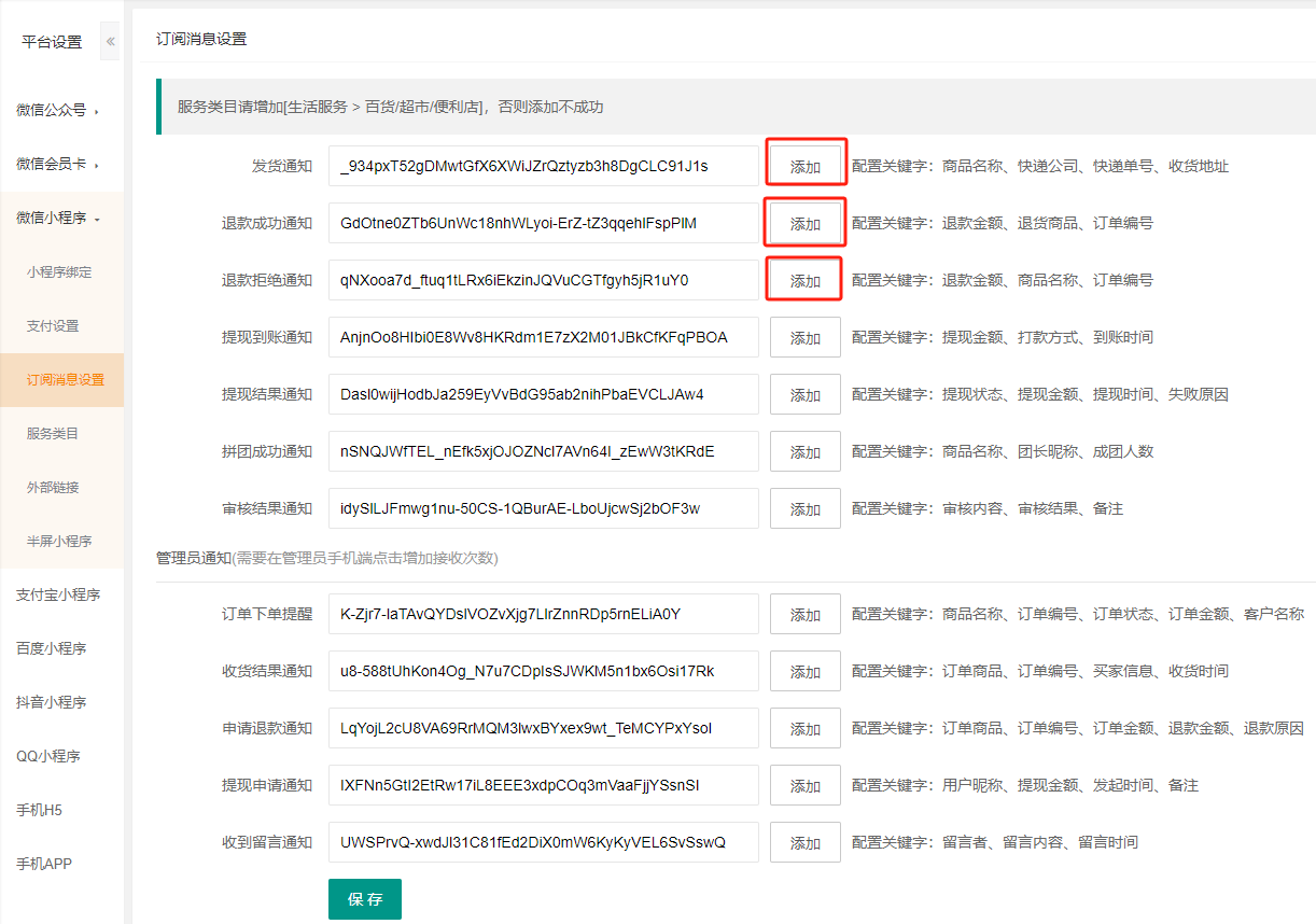 位置:后台--平台--微信小程序--订阅消息设置--添加订阅消息