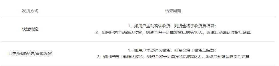 商家发货后,订单资金进入结算周期。在用户主动/系统自动确认收货后(在用户点击“确认收货”、或商家录入发货信息后达到系统自动确认收货的时间周期),进行资金结算。不同发货方式对应不同的结算周期,详见下表(微信官方文档:https://developers.weixin.qq.com/miniprogram/product/jiaoyilei/yunyingguifan.html)。