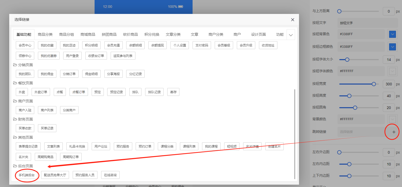 第二步:瑞速后台---设计---设计页面---编辑设计页面---放组件(此处我们放的“按钮”组件,可自定义组件)----选择跳转链接“手机端后台”