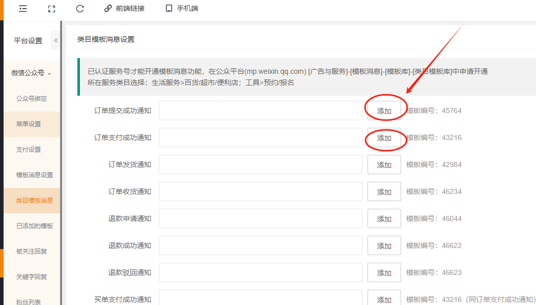 注:管理员、服务人员和配送员的模板消息是配置公众号里的