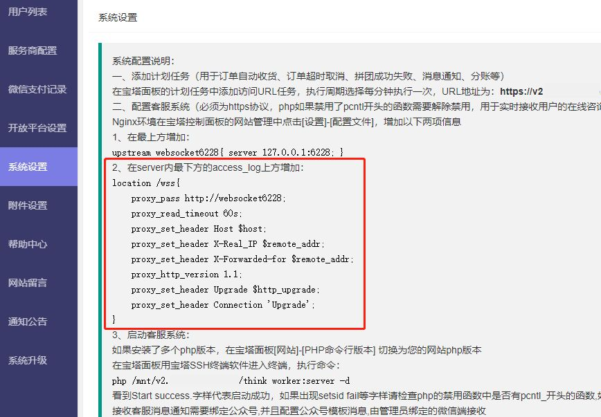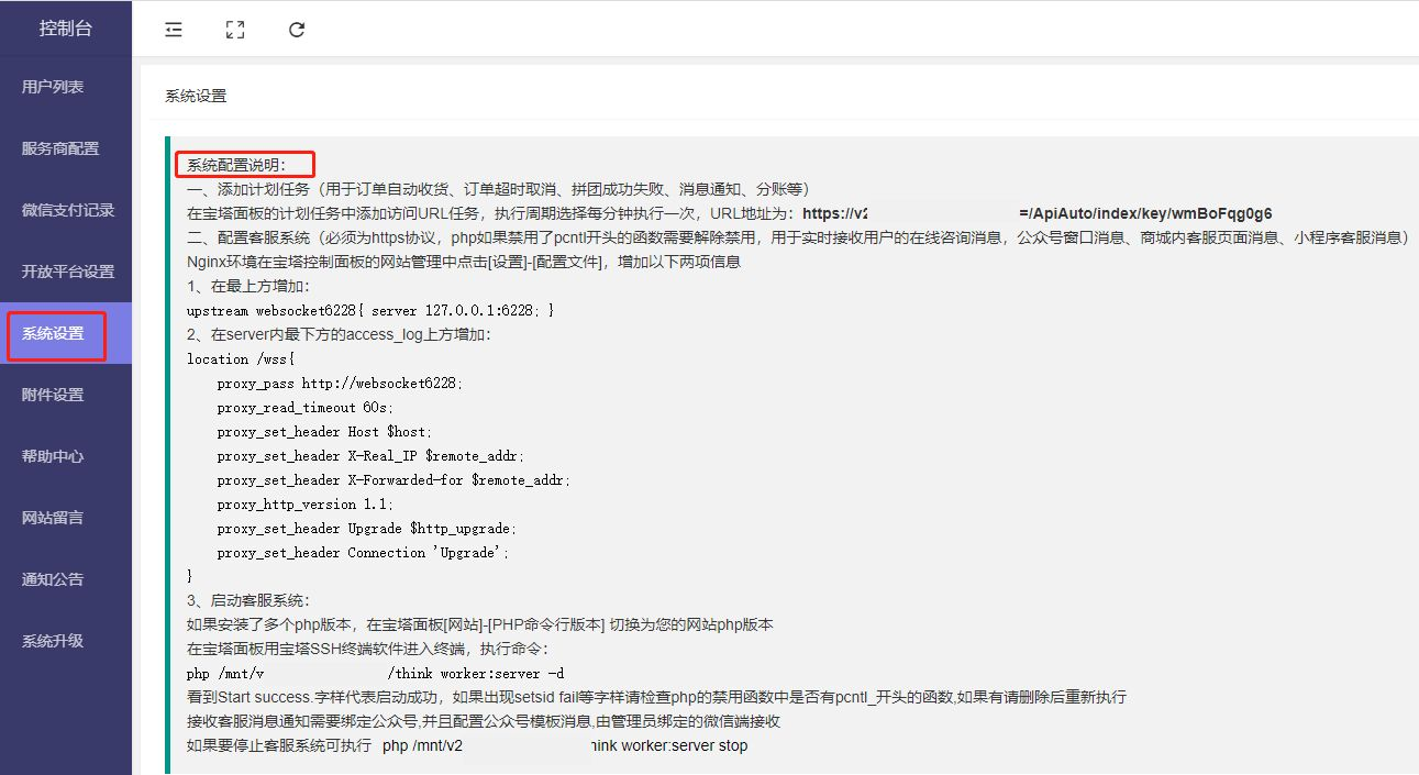 配置客服系统(必须为https协议,php如果禁用了pcntl开头的函数需要解除禁用,用于实时接收用户的在线咨询消息,公众号窗口消息、商城内客服页面消息、小程序客服消息)