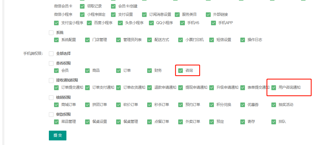 第二步:配置好客服后在系统—管理员列表添加管理员,给管理员相应的权限(咨询,用户咨询通知)