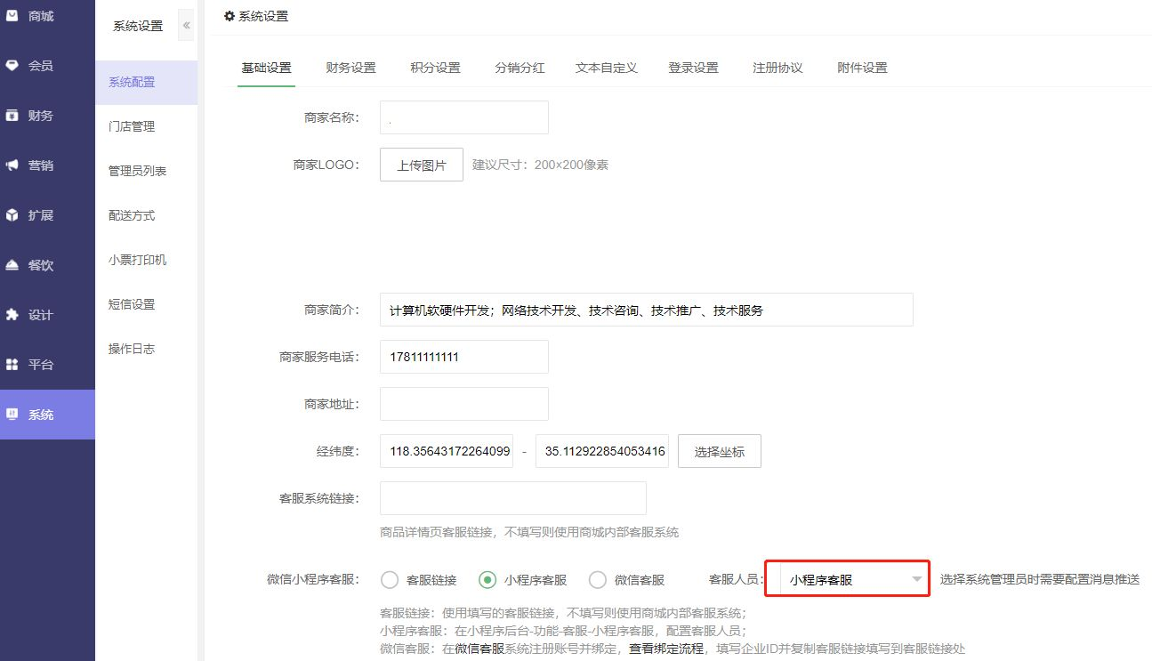 看下后台—系统—系统设置里选择了哪种客服(商城内部客服系统或小程序客服)点击查看设置教程