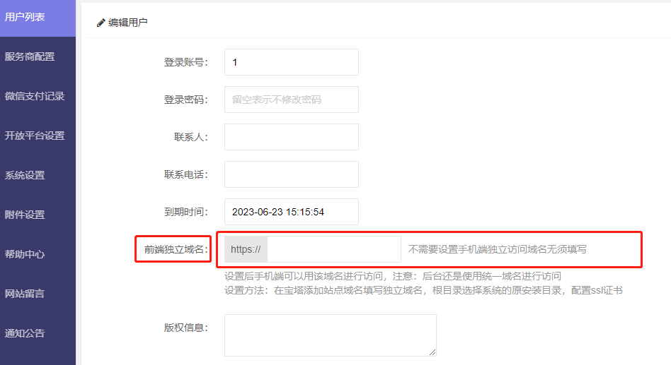 注意:如果配置了前端独立域名后,系统客服发不了消息,需要重新配置下客服系统的第二步