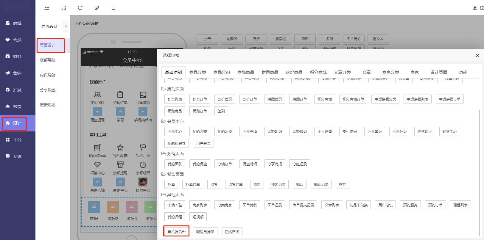 第二步:在设计—设计页面添加控件(按钮)关联手机端后台链接