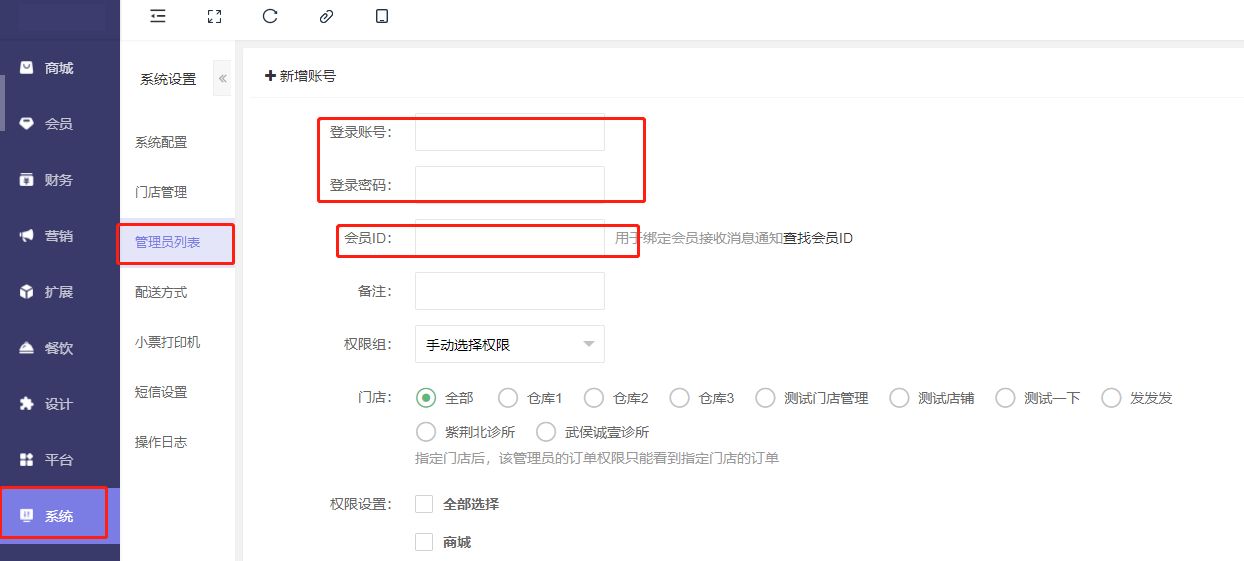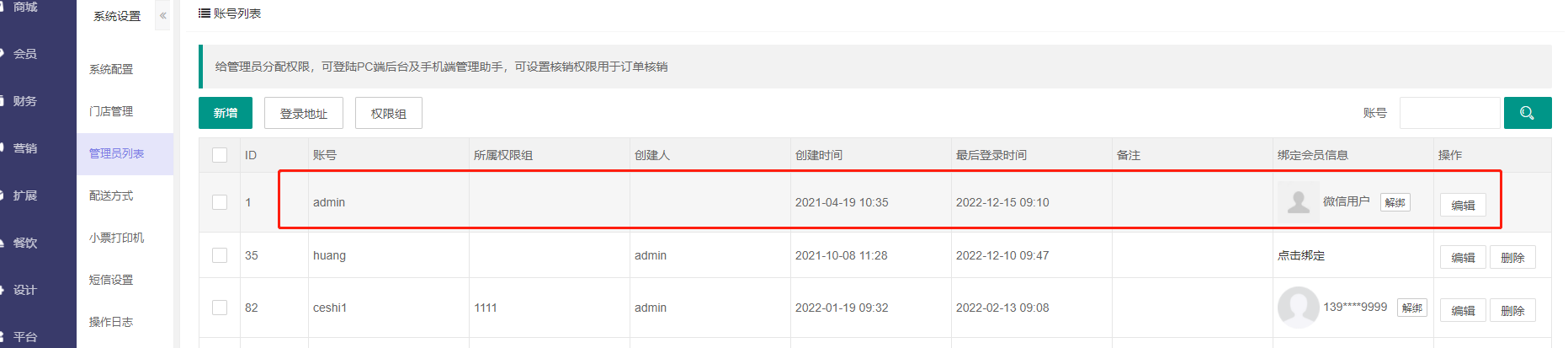 第一步:系统—管理员列表里添加管理员,给管理员添加手机端权限