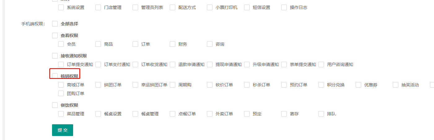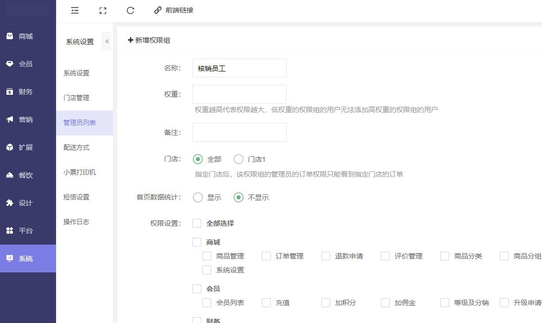 第一步:登录商城后台---系统---管理员列表---添加权限组---选择手机端核销权限---提交