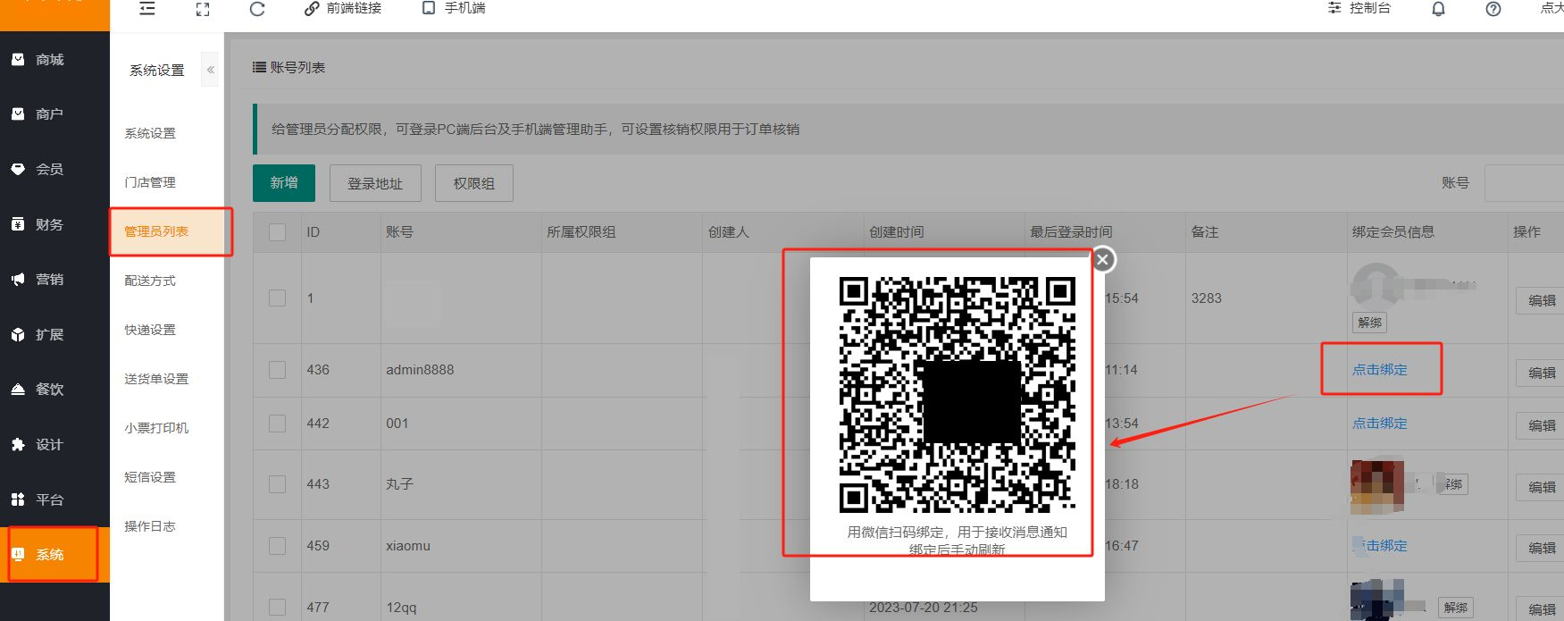 1、商城后台---系统---管理员列表---登录地址---微信扫公众号码或小程序码,登录会员账号后输入管理员账号密码登录管理员账号进行绑定---管理员账号里点击右上角的扫码图标去核销