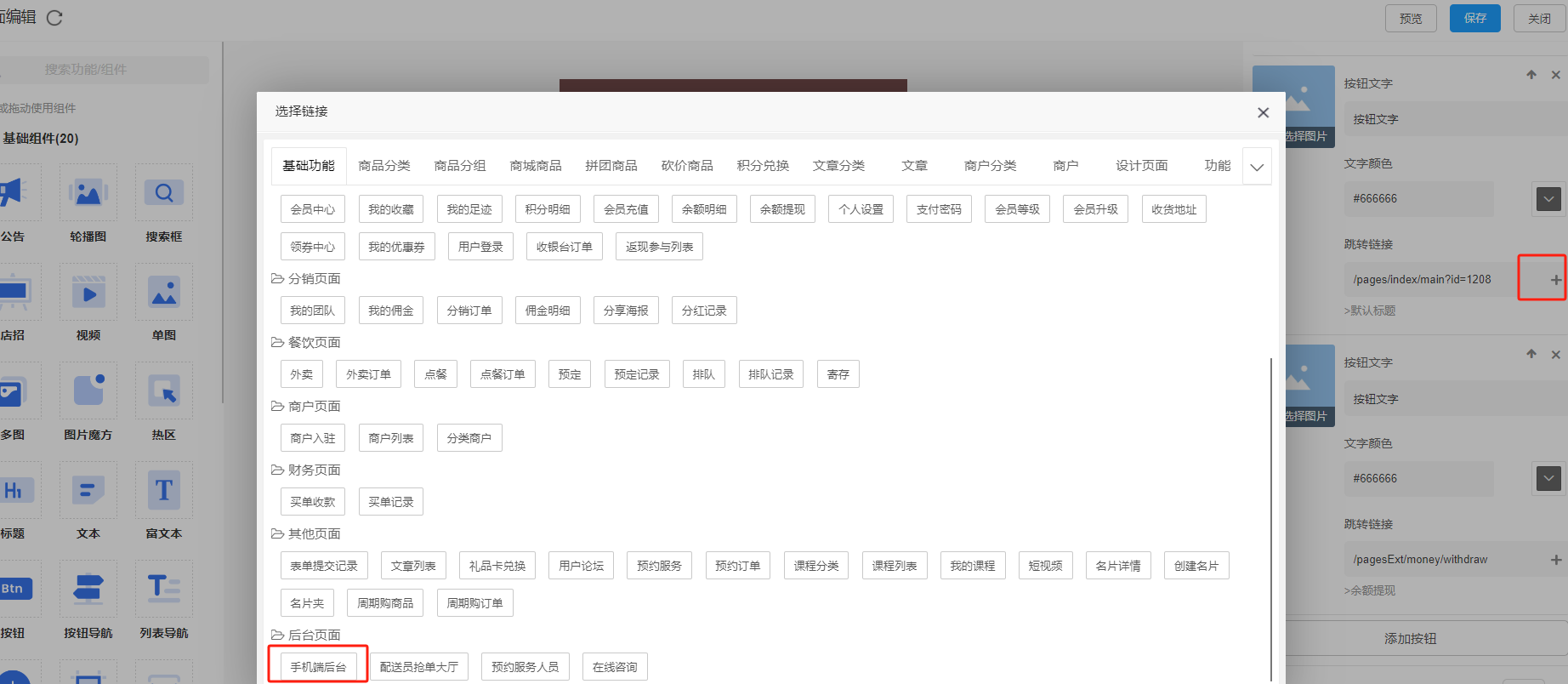 3、后台---设计---页面设计---添加组件---选择链接----选择“手机端后台”---有核销功能的管理员在前端通过这个组件登录手机端后台---点击右上角的扫一扫