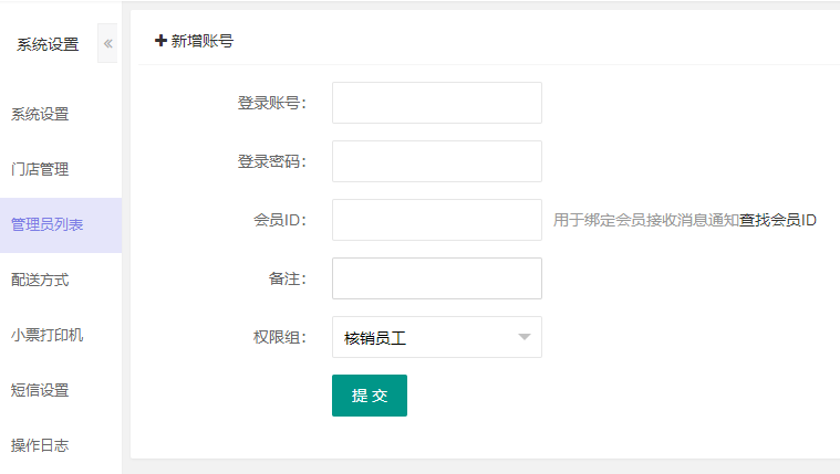 第二步:商城后台---系统---新增管理员列表---登录账号,密码,ID,选择第一步添加的权限组---提交