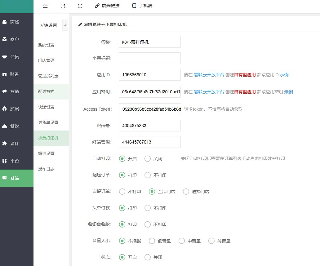 登录商城后台---系统---小票打印机---添加易联云打印机---配置打印机信息及K8打印机推送地址