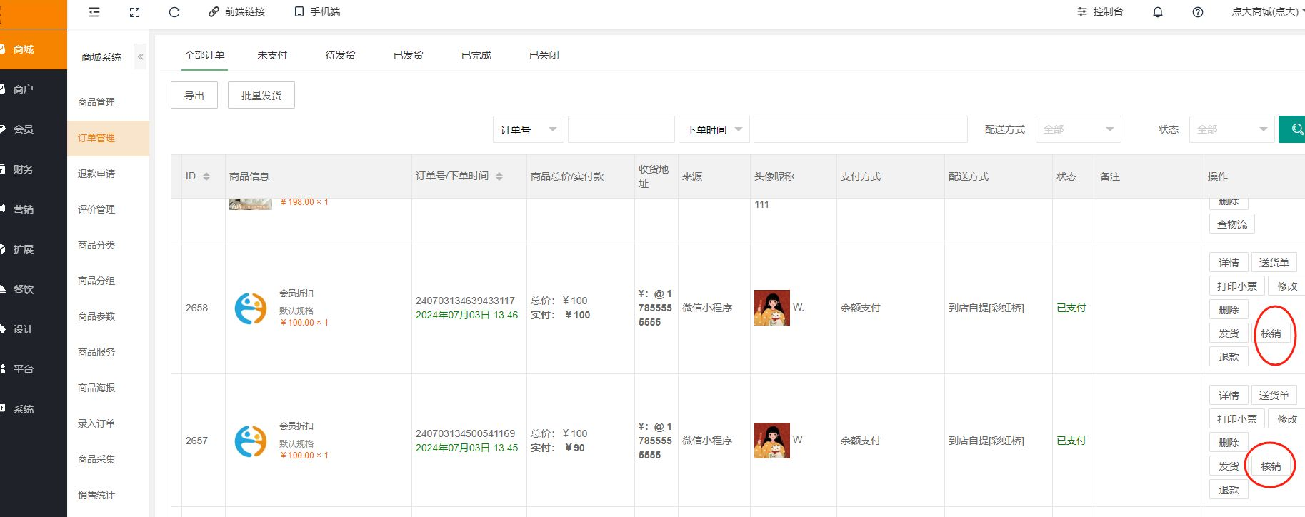 注:多商户也可以核销,登录多商户后台添加管理员们并给核销权限,登录多商户管理员账号核销,步骤与第1种和第3种同理