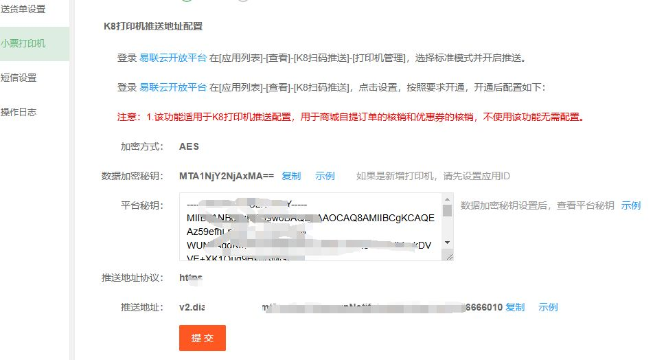 注意:1.该功能适用于K8打印机推送配置,用于商城自提订单的核销和优惠券的核销,不使用该功能无需配置。