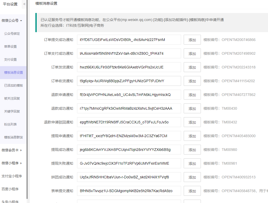 (已认证服务号才能开通模板消息功能,所在行业选择:IT科技/互联网|电子商务)