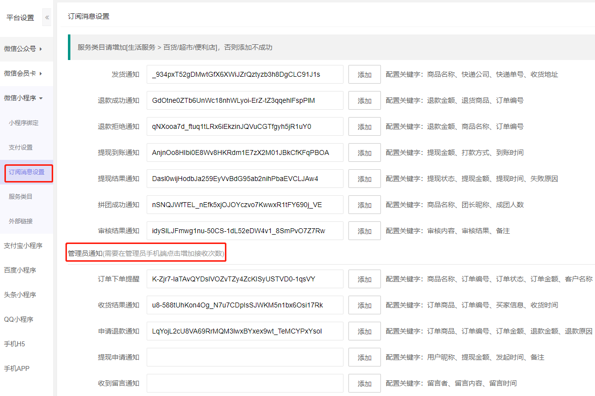 用于给用户和管理员发送小程序通知,管理员通知需要在管理员手机端点击增加接收次数