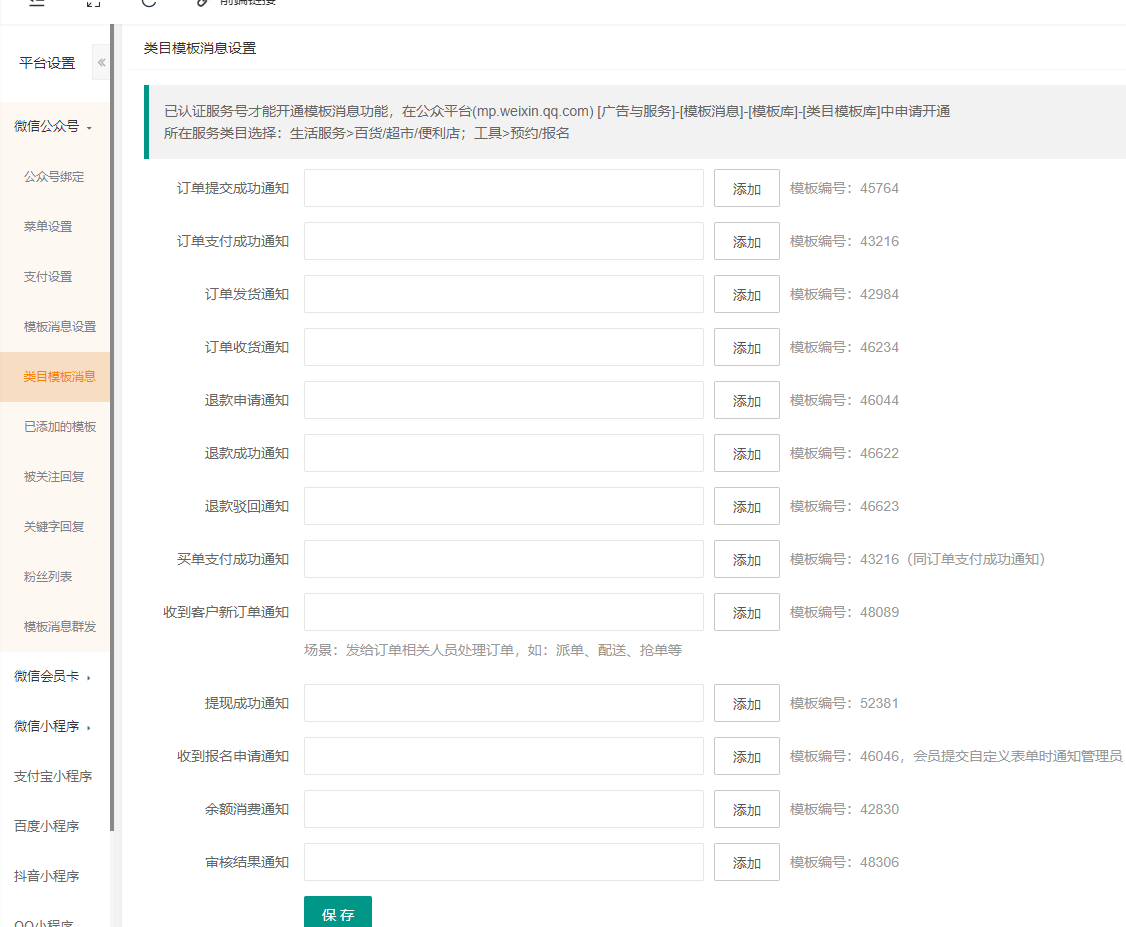 微信修改规则后通过公众号发送模板消息需使用类目模板消息,如果之前配置了模板消息仍可用之前的配置,若未配置模板消息则需配置类目模板消息,开通流程可看[平台设置--微信公众号--类目模板消息]https://www.kancloud.cn/yuzxz/ddv2/3183491()