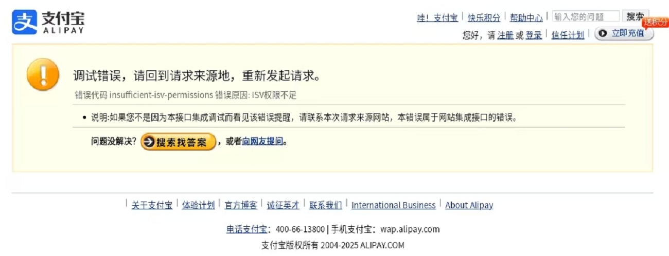 h5端进行支付宝支付提示“错误原因:ISV权限不足”