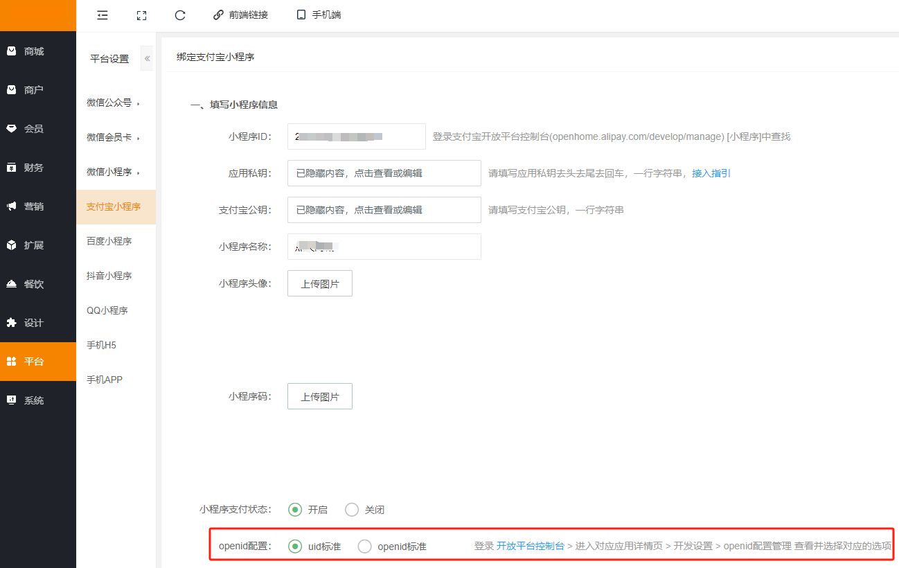 1、后台--平台--支付宝小程序里检查openid配置是否跟开放平台里对应