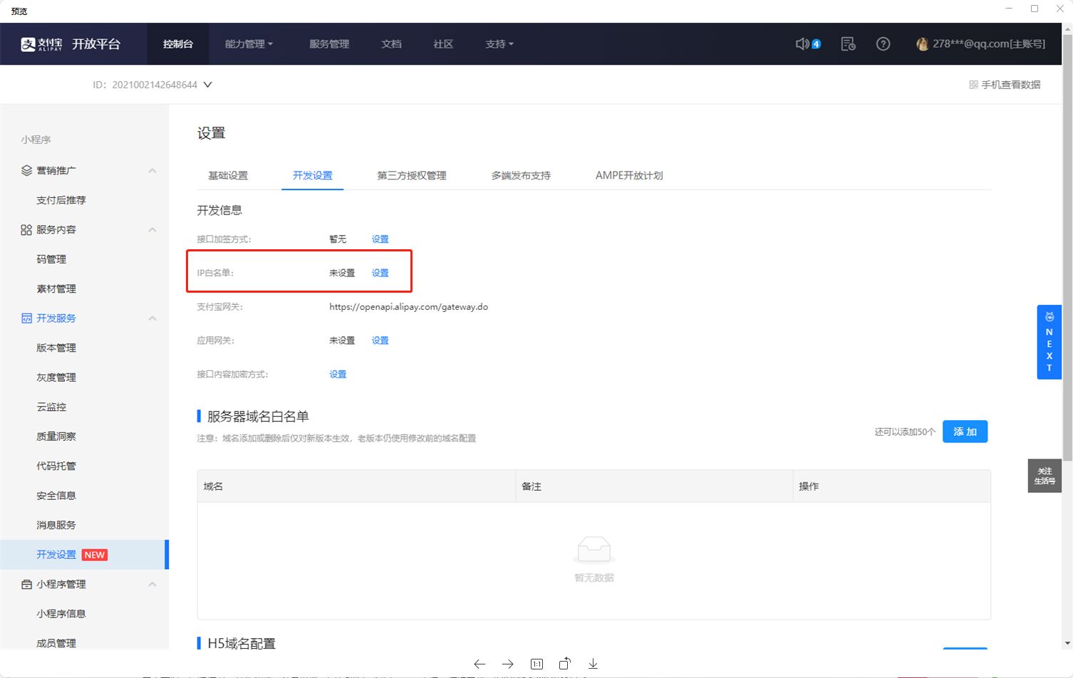 支付宝支付的订单退款后台提示当前调用IP不在可信名单中,需要到支付宝开放平台-开发设置里设置IP白名单