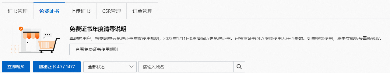 4、在免费证书页签,单击创建证书。创建证书按钮中的数字表示剩余可申请的免费证书个数/总共可申请的免费证书个数。只有当剩余可申请的免费证书个数不为0时,您才可以创建证书。如果剩余可申请的免费证书个数为0,建议您单击立即购买,获取可用的免费证书个数。