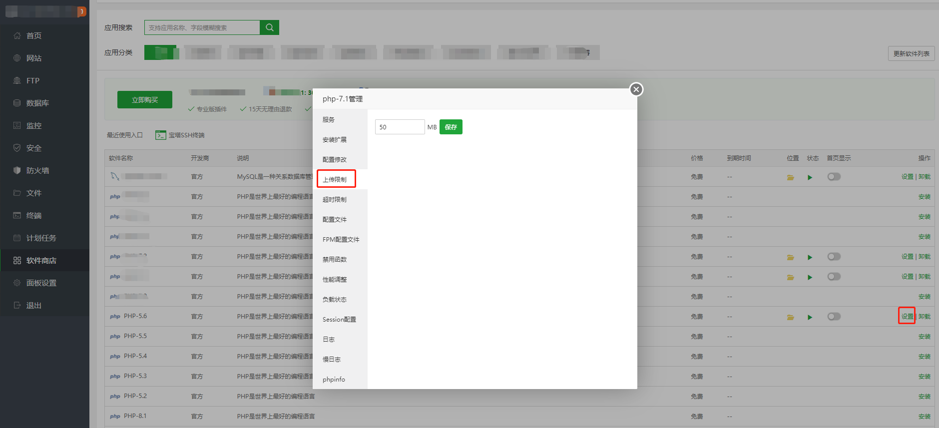 登录宝塔面板--找到软件商店---找到已安装过的php版本---点击设置--上传限制和超时时间