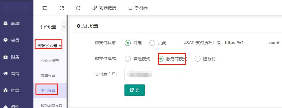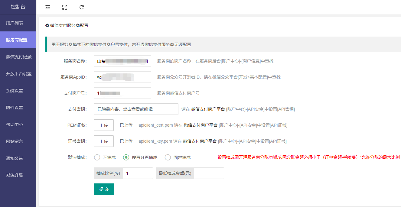 注:总平台抽子平台,此处需用服务商模式,填写子商户号,如不抽成可选择其他模式设置