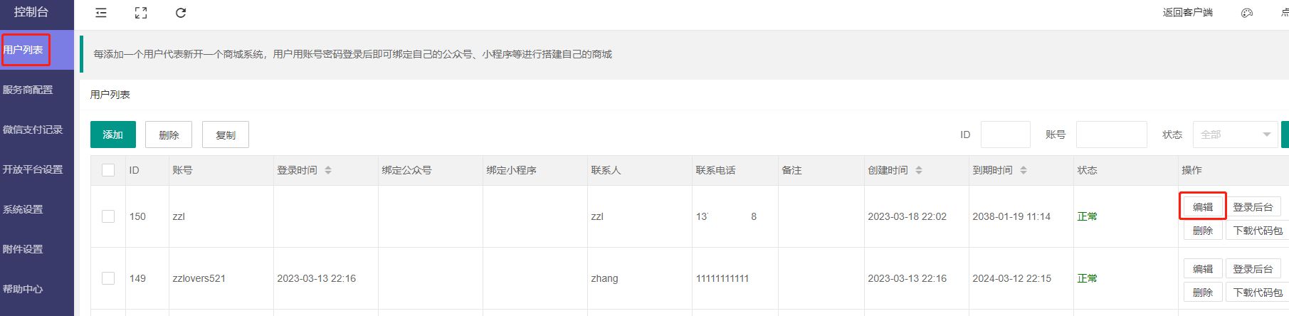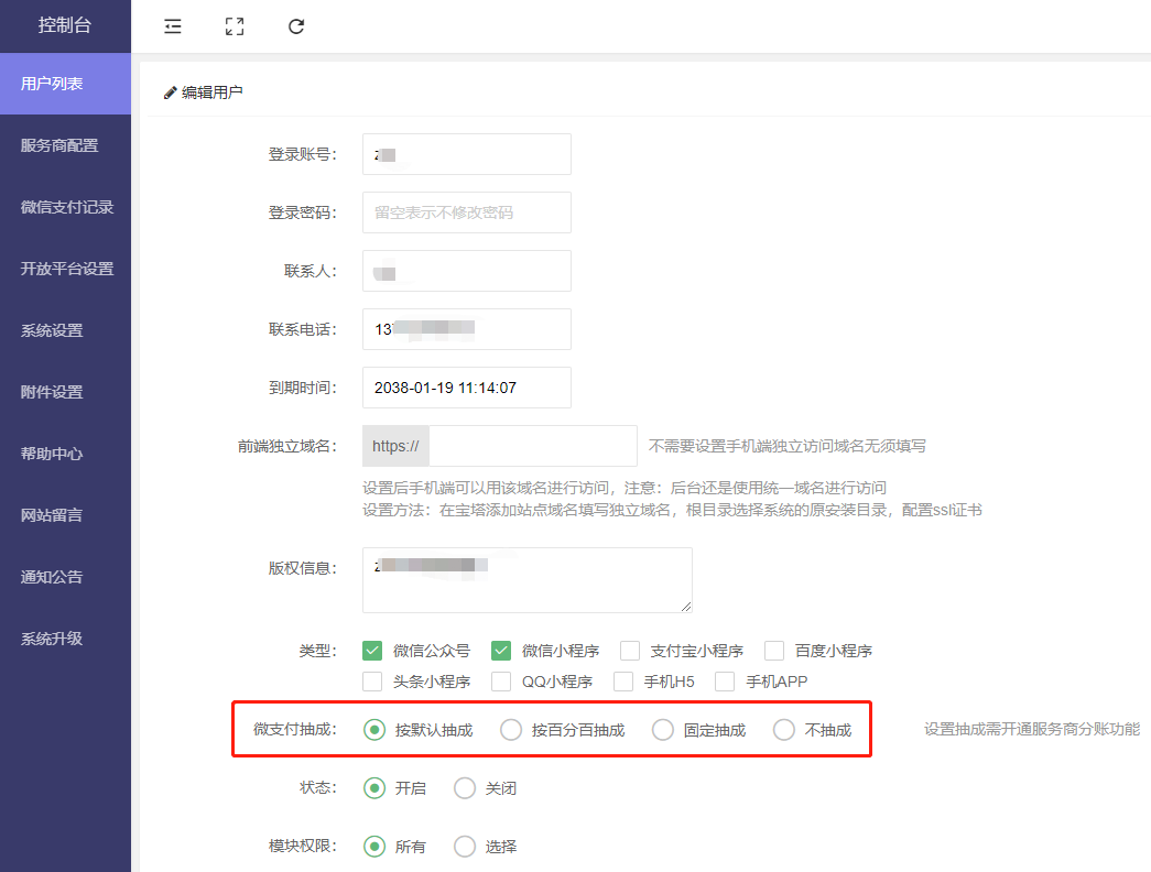 2.控制台-用户列表-编辑-微支付抽成