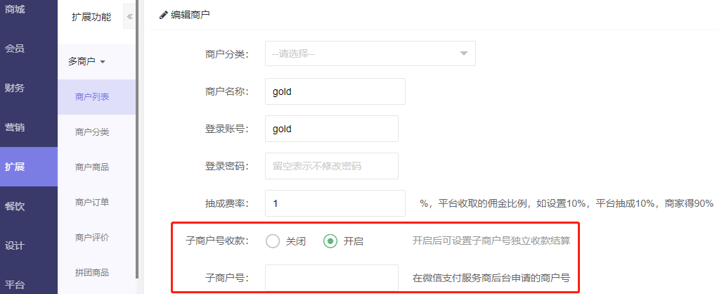 子平台抽多商户时,分账比例需在扩展-多商户-商户列表-编辑-抽成费率里设置
