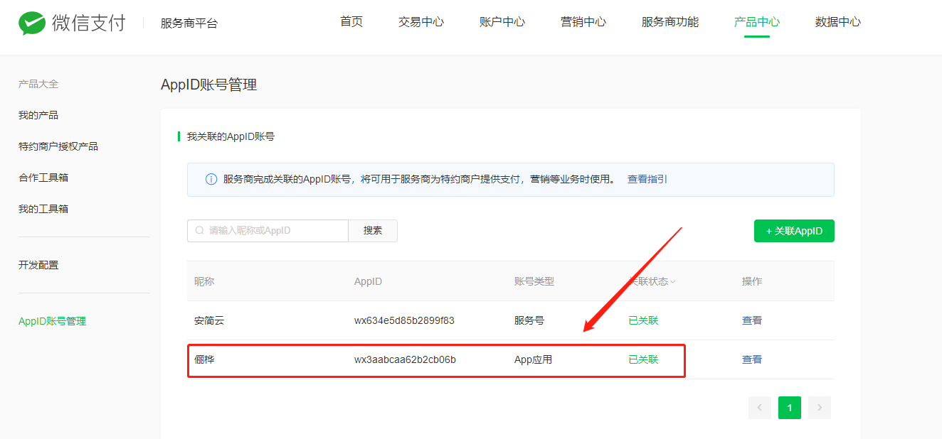 2、如果是不同主体,需要在服务商后台-产品中心-AppID账号管理关联以及特约商户APPID配置中添加关联的APPID