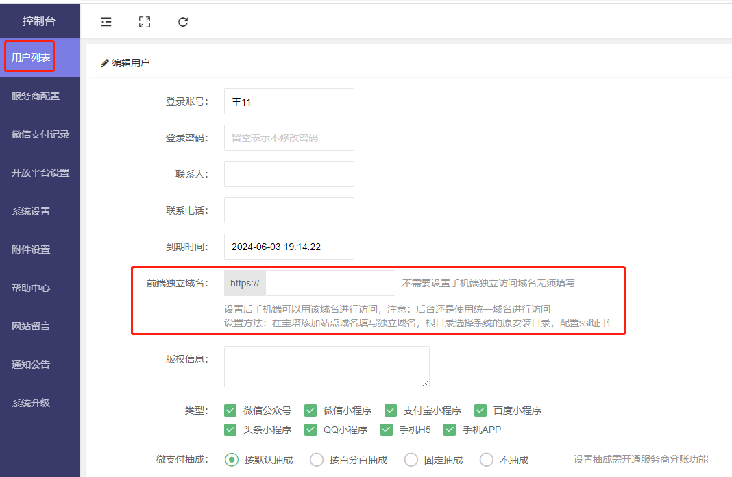 设置后前端使用此独立域名,H5入口需要去后台复制,域名不是入口!