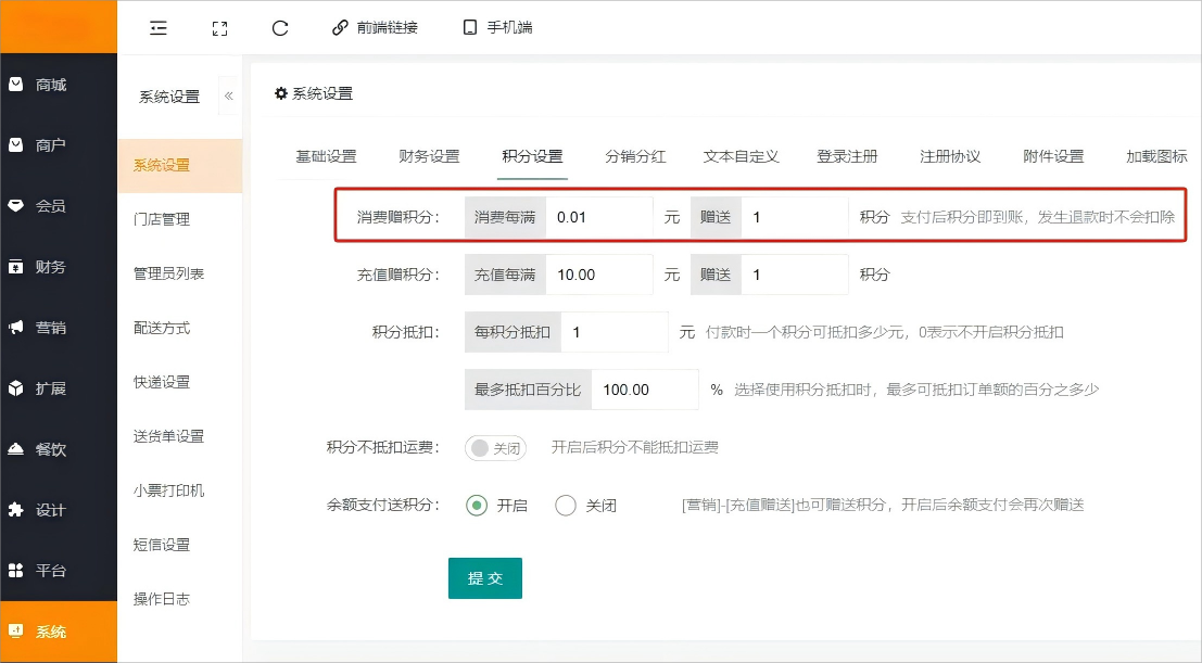 系统--系统设置--积分设置,支付后积分即到账,退款时扣除,积分不足时可扣除为负值