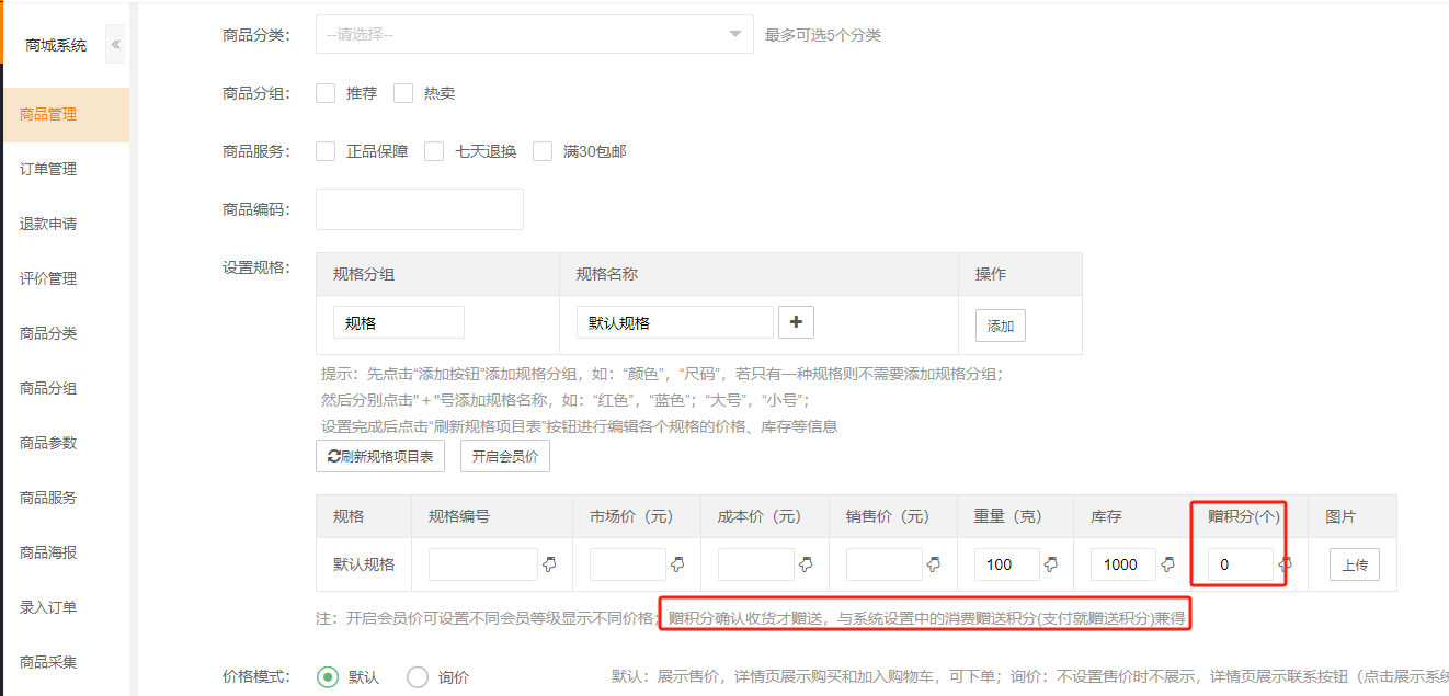 商城--商品管理--添加商品/编辑商品--规格处设置赠送积分,确认收货才赠送,与系统设置中的消费赠送积分(支付就赠送积分)兼得