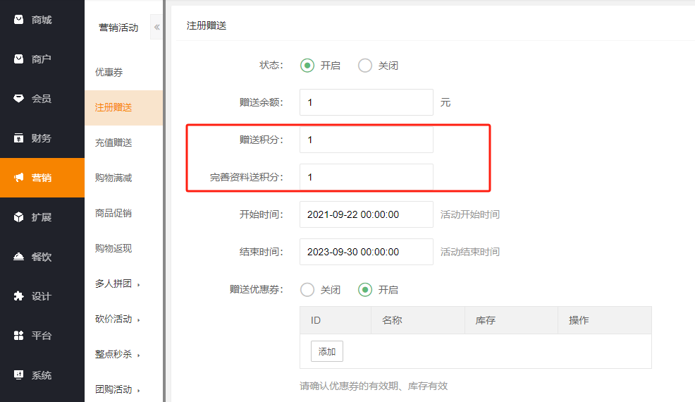 系统--系统设置--积分设置--充值赠送积分