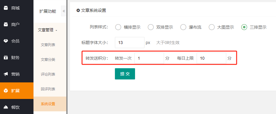 扩展--文章管理--系统设置--转发送积分