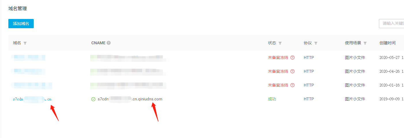 2、Bucket创建成功以后,我们点击Bucket,找到域名管理。点击绑定域名,填写一个我们想要使用的域名。添加成功以后,将域名CNAME解析到七牛。