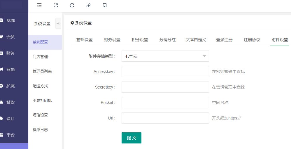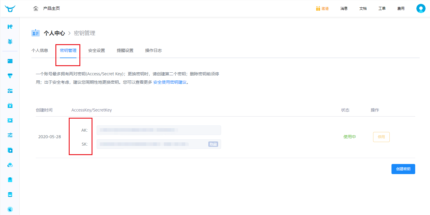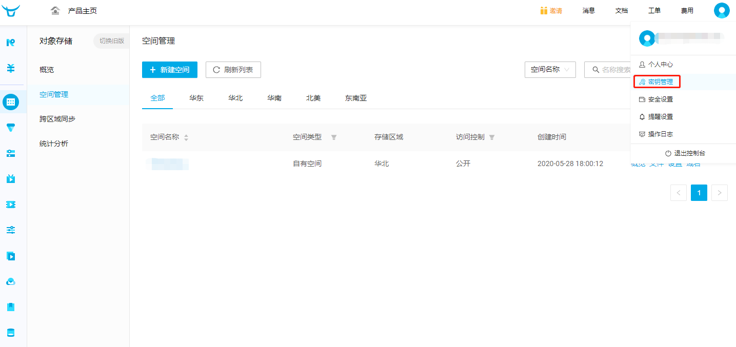 3、创建完毕点击右上角头像个人中心-选择秘钥管理进入个人中心秘钥管理,将此处的AccessKey,SecretKey复制到后台的对应位置,Bucket填入刚刚创建的Bucket即可,此处的URL填写上面我们添加的域名,点击保存。