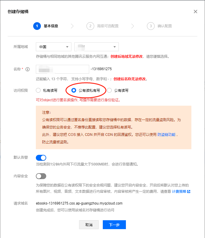 2、点击存储桶列表-创建存储桶,所在地跟服务器所在地一致,访问权限选择公有读私有写,其他使用默认设置