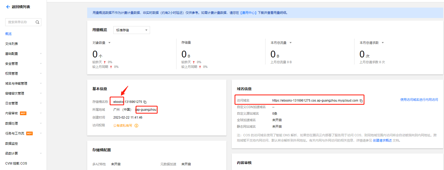 3、点击刚才创建的存储桶,找到存储桶名称、bucket所属地域和访问域名,并填写到后台。
