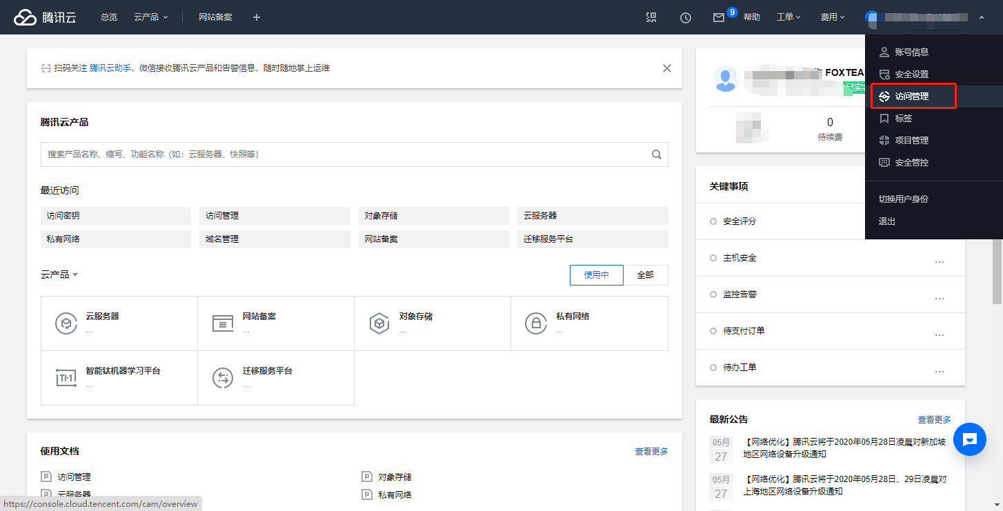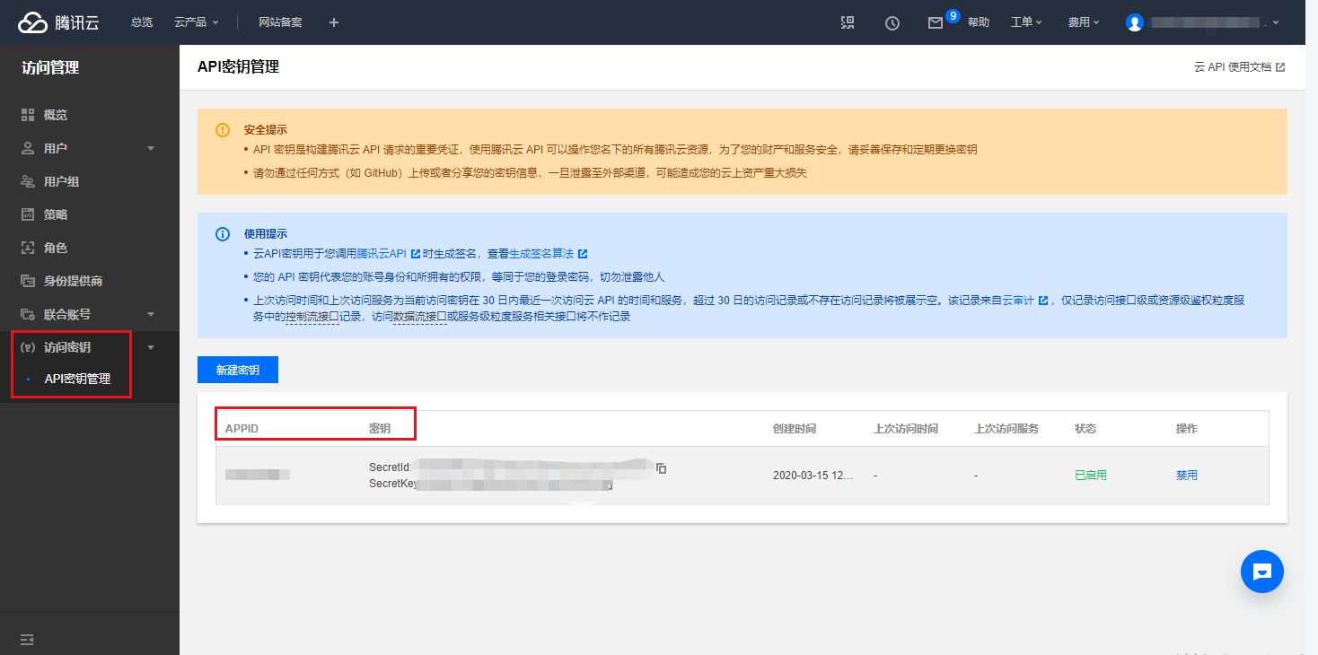 4、点击右上角头像个人中心-选择访问管理-访问秘钥-API秘钥管理,将此处的App ID,Secret ID,Secret Key复制到后台。