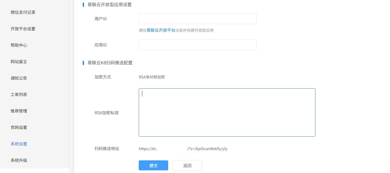 将RSA加密私钥填写到控制台--系统设置---打印机接口设置---易联云K8扫码推送配置