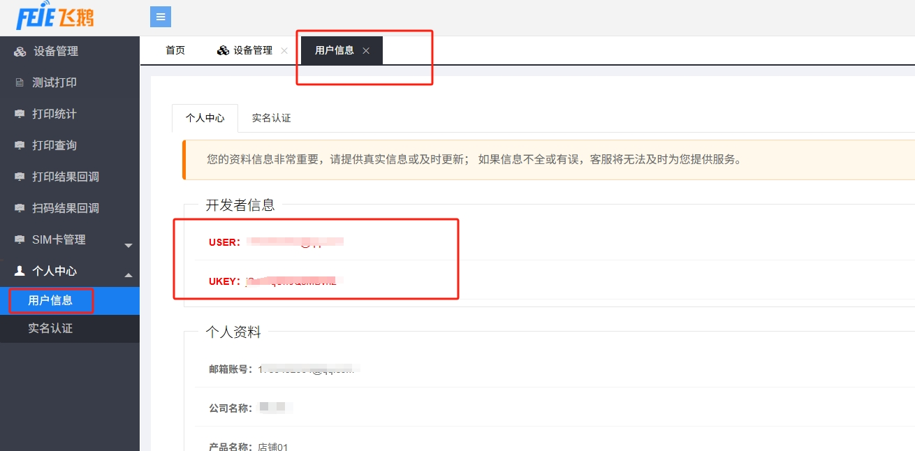 需填写飞鹅开发者USER、飞鹅开发者UKEY