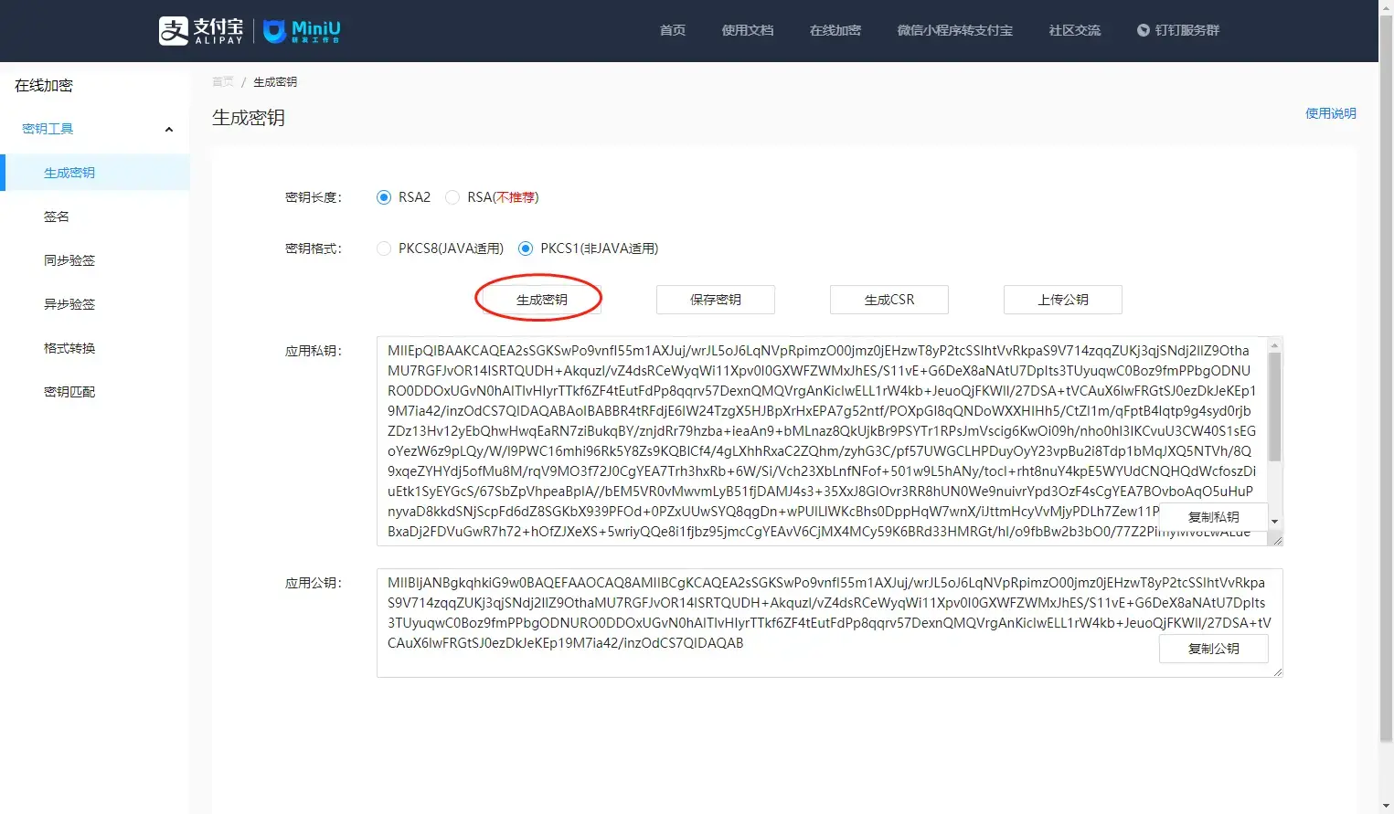 使用支付宝Web在线加密工具生成密钥 https://miniu.alipay.com/keytool/create