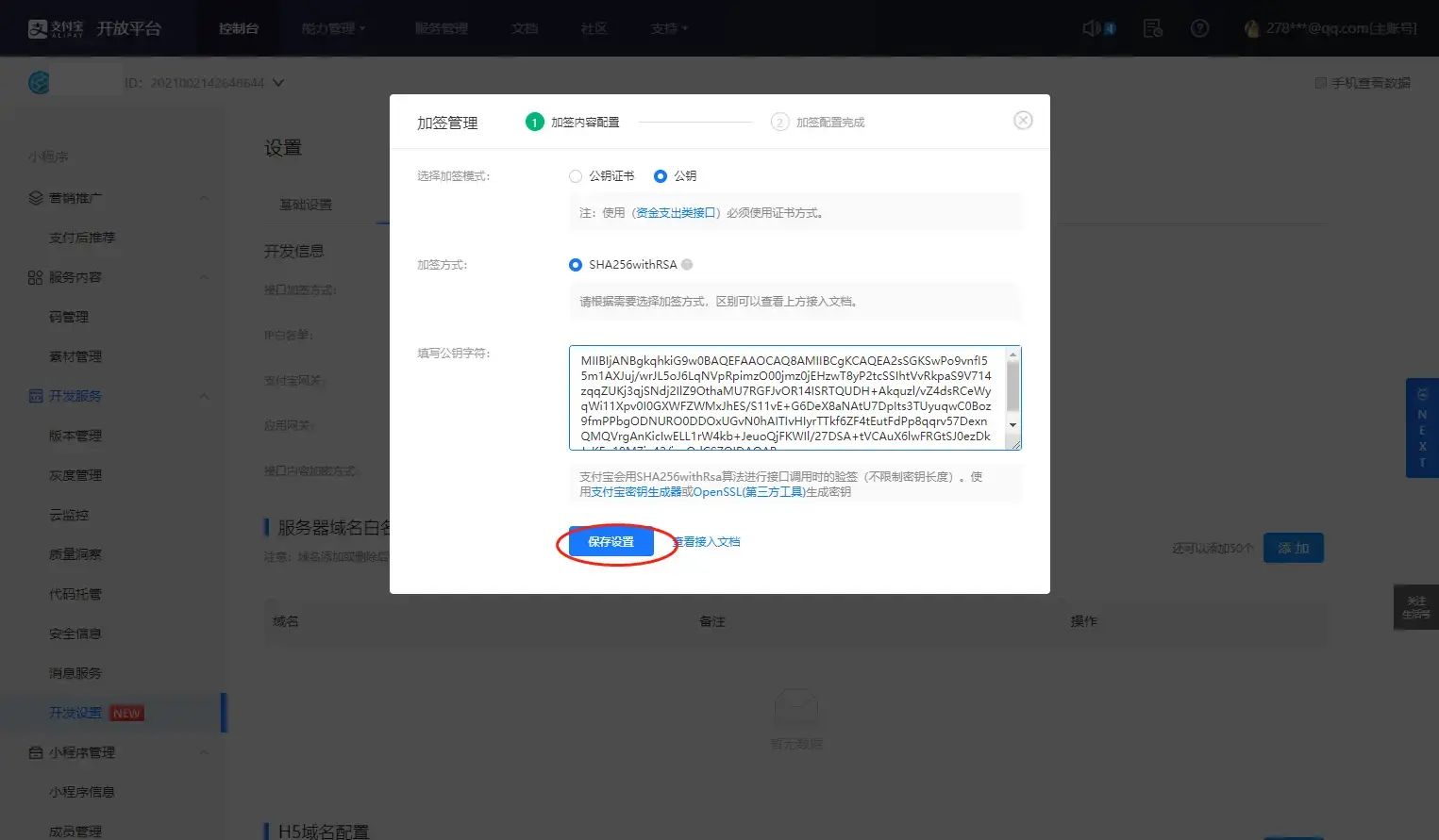 点击生成密钥,将应用私钥填写到商城的开发者私钥中,将应用公钥填写到支付宝的[填写公钥字符]中