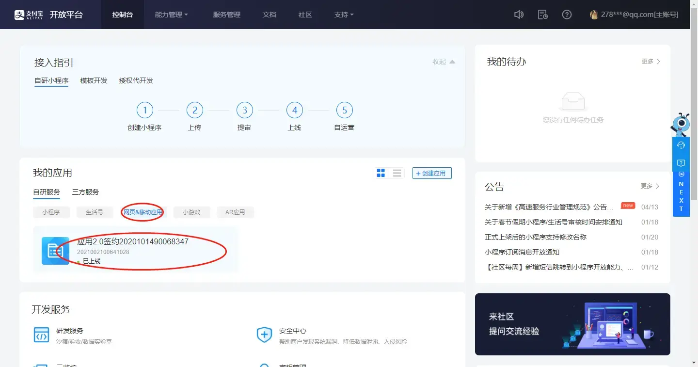 首先登录支付宝开放平台创建网页&移动应用