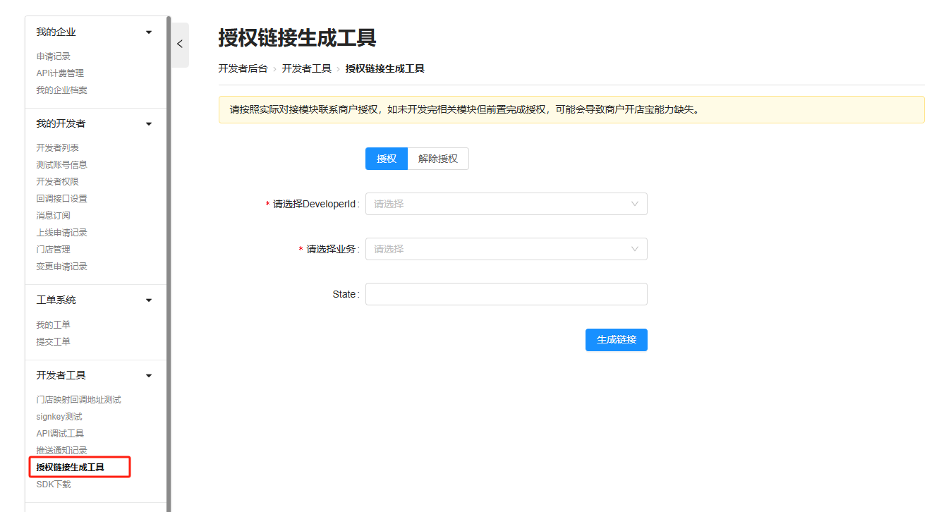 关联门店后,获取授权链接,浏览器打开链接登录美团系统进行授权