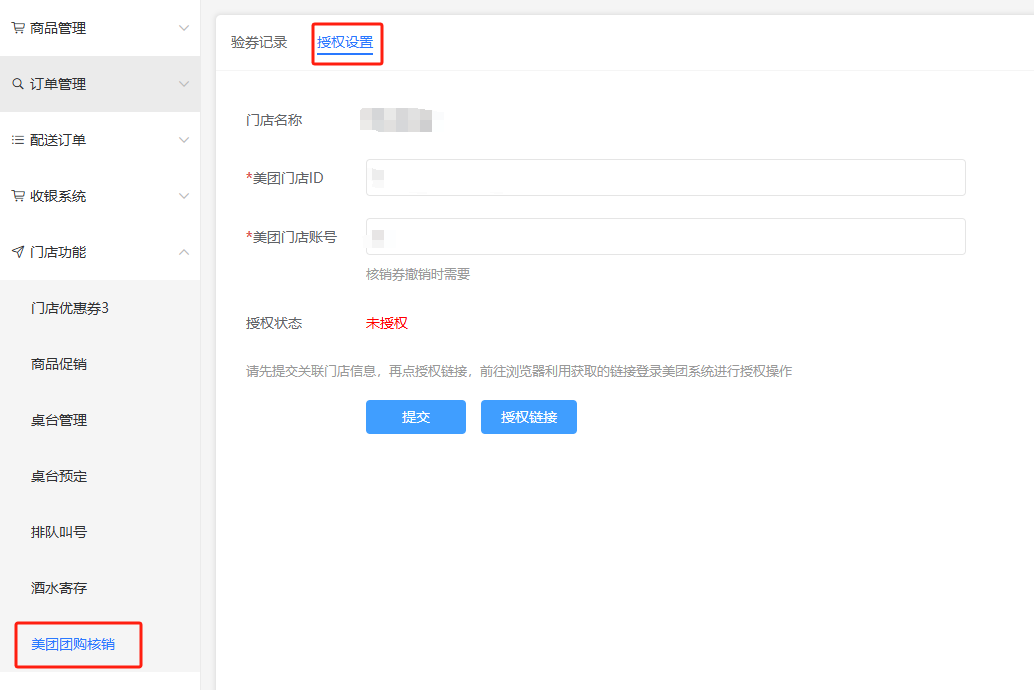 美团团购开发者信息配置完成后,进行门店关联授权操作,门店或系统管理员均可操作
